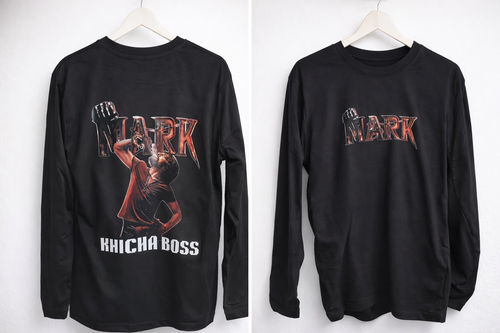 A black long-sleeve T-shirt mockup displayed on a hanger against a clean white background. On the back of the T-shirt, a dramatic, high-contrast graphic of a powerful male singer holding a microphone and singing passionately upward, wearing a dark red shirt. Above the figure, bold metallic text reading “MARK” in a rugged, rock-style font with sharp edges and a raised fist graphic integrated into the letter design. Below the singer, strong block typography reading “KHICHA BOSS” in white, slightly distressed lettering. Cinematic lighting, realistic fabric texture, professional apparel photography style, centered composition, ultra-high resolution, print-ready design.